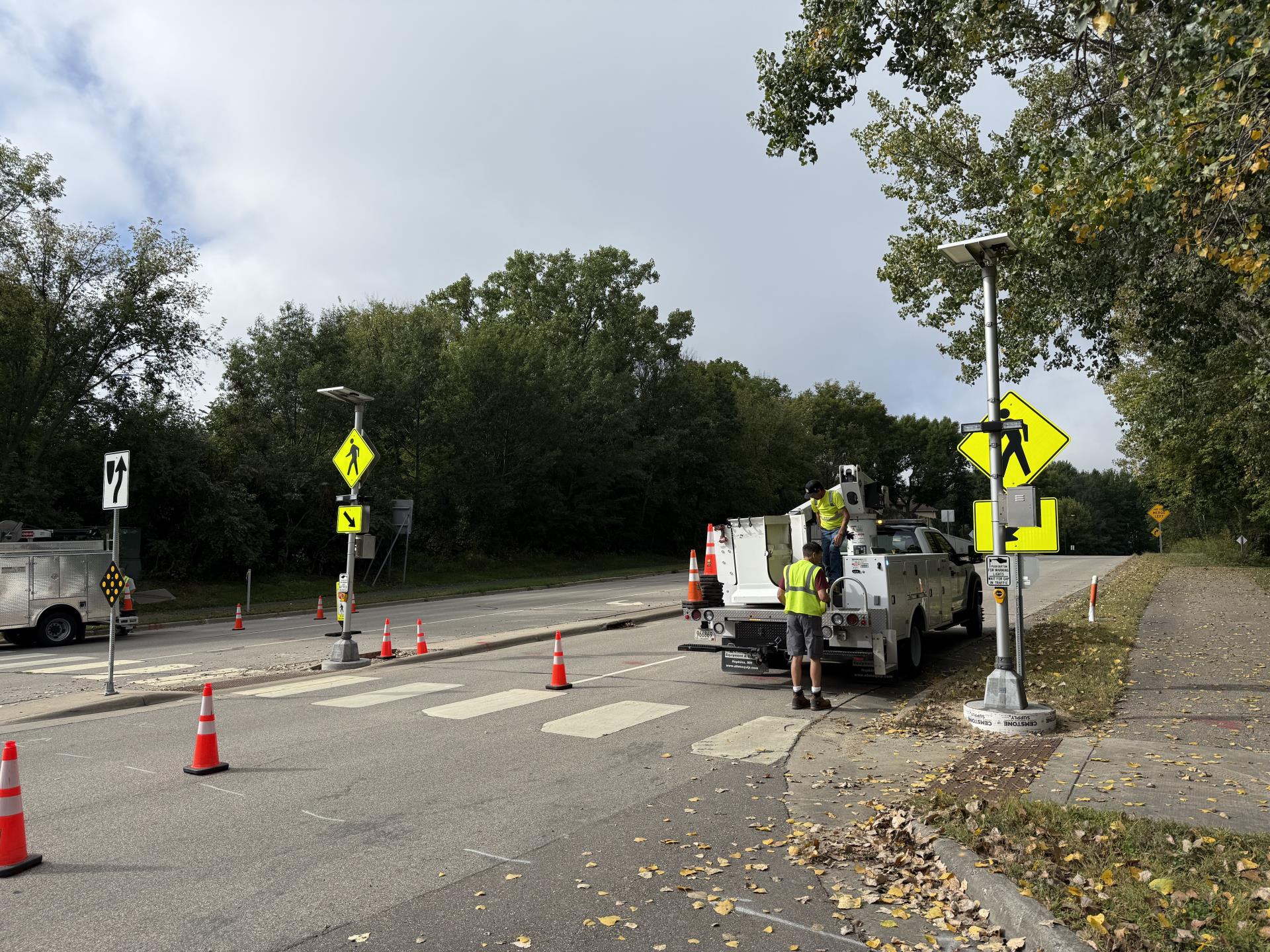 This project was a team effort across several City divisions. The Police Department identified a state safety grant, which the Engineering Division applied for and secured $64,000 to fund the beacons. Engineering also designed the crossings, and the Streets and Utilities Divisions installed the RRFBs. The City plans to install two or three more RRFBs each year to continue improving pedestrian safety.